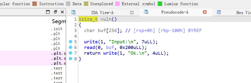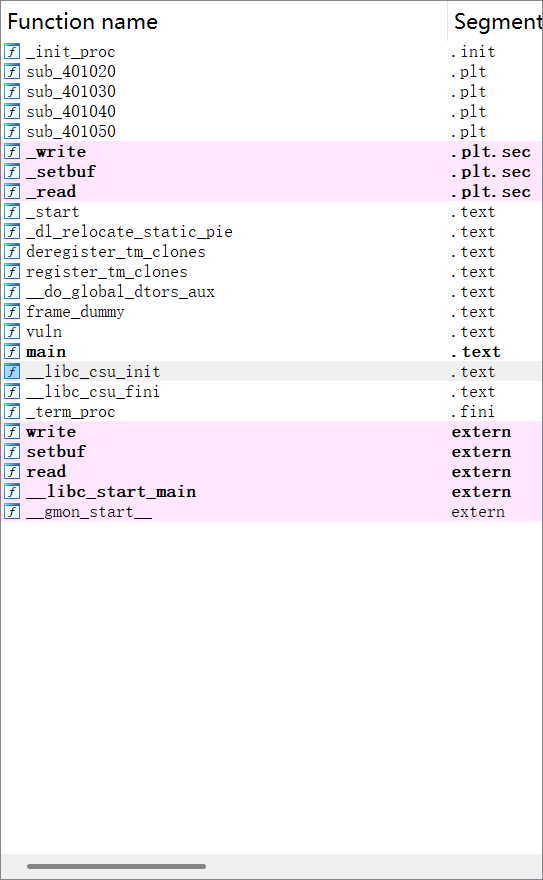 在vuln()函数 发现栈溢出点,无后门函数