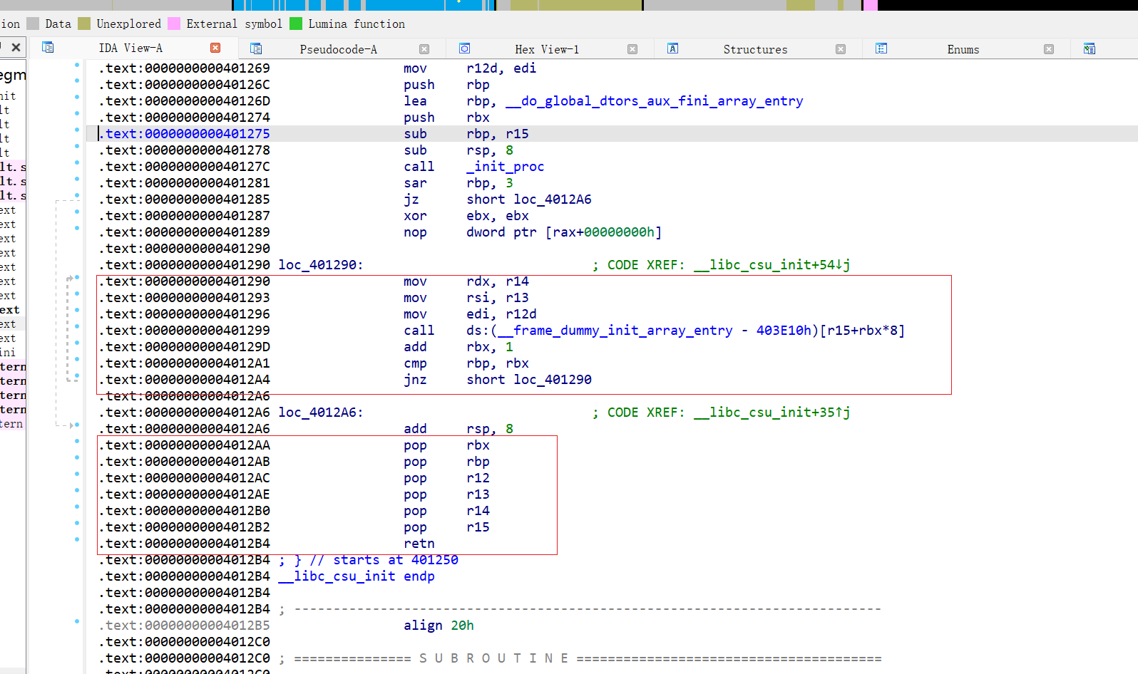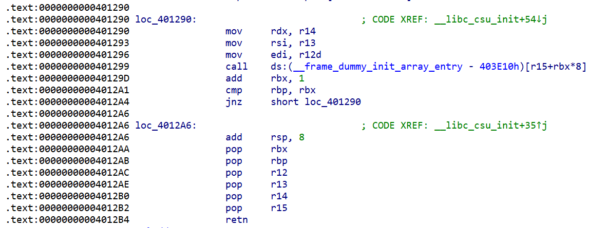 | 0x401299 | call ds:(__frame_dummy_init_array_entry - 403E10h)[r15+rbx*8] | 调用 函数 [r15 + rbx8](调用的是 [r15 + rbx8]这个地址 ,指向的函数地址) |